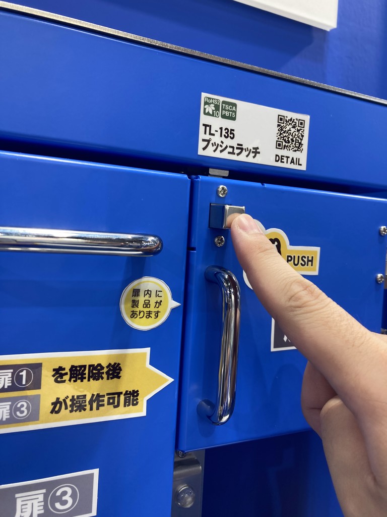 ロックはラッチにより扉や蓋を押し込むだけ。解錠はプッシュボタンを押すだけの簡単操作です。
