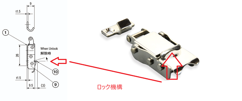 部品表⑩のストッパーを上にあげることで、解除する仕様のキャッチになります。