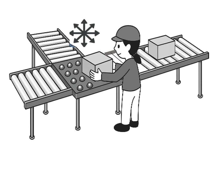 図のように搬送ラインの交差部に配置すると、製品や荷物を360°方向にスムーズに移動・方向転換できます。