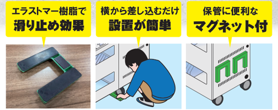 本商品は、地震時の小型キャビネットの移動止(滑り止め)目的で作られました。