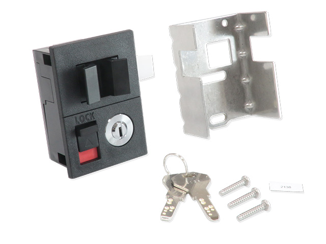 レバーの開閉操作で筐体・本体と扉・蓋を固定・保持させるための部品です。