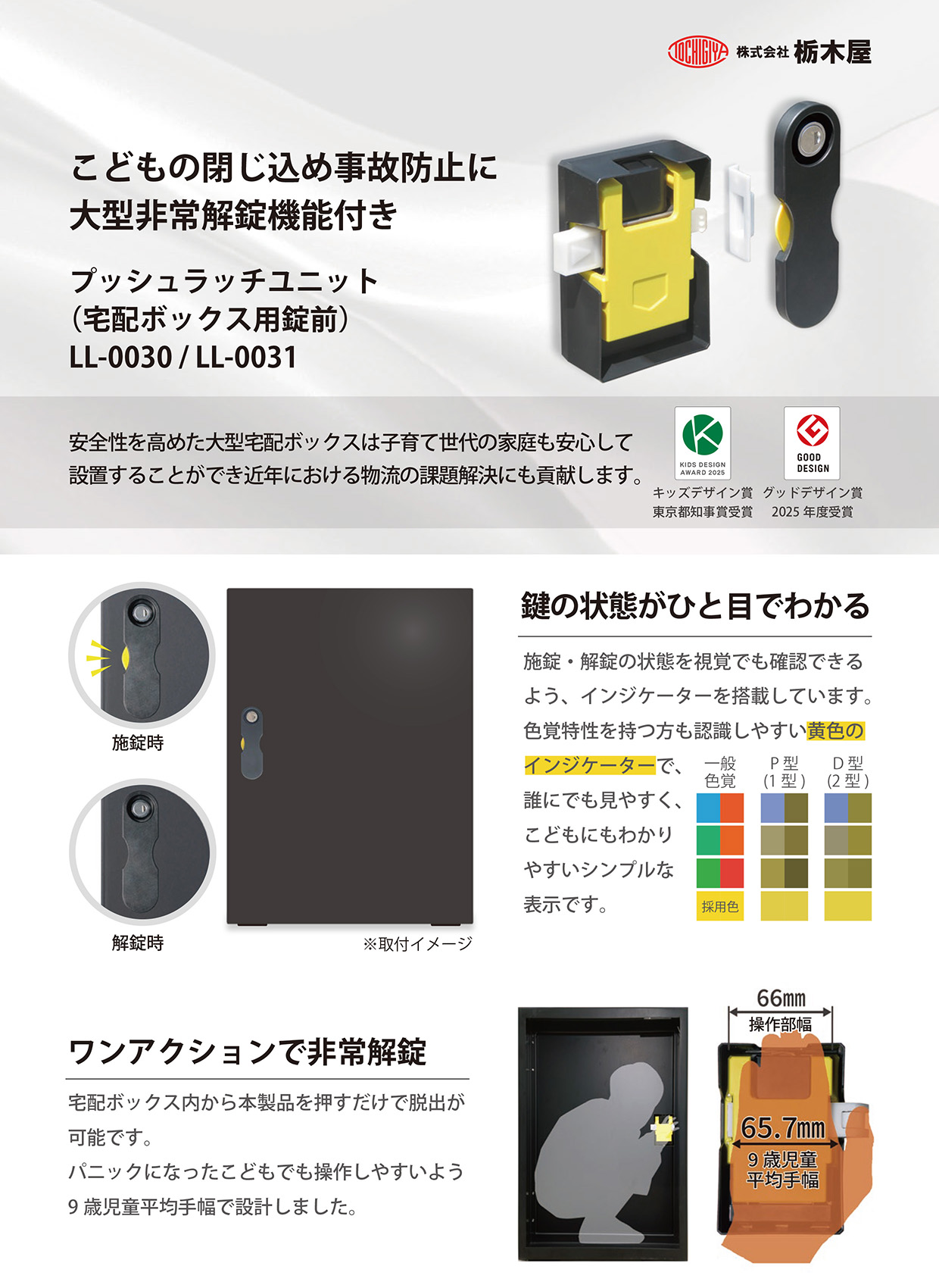 抜き差ししやすいディンプル錠を採用し、耐候性に優れる樹脂製インジケーターを備えた宅配錠です。