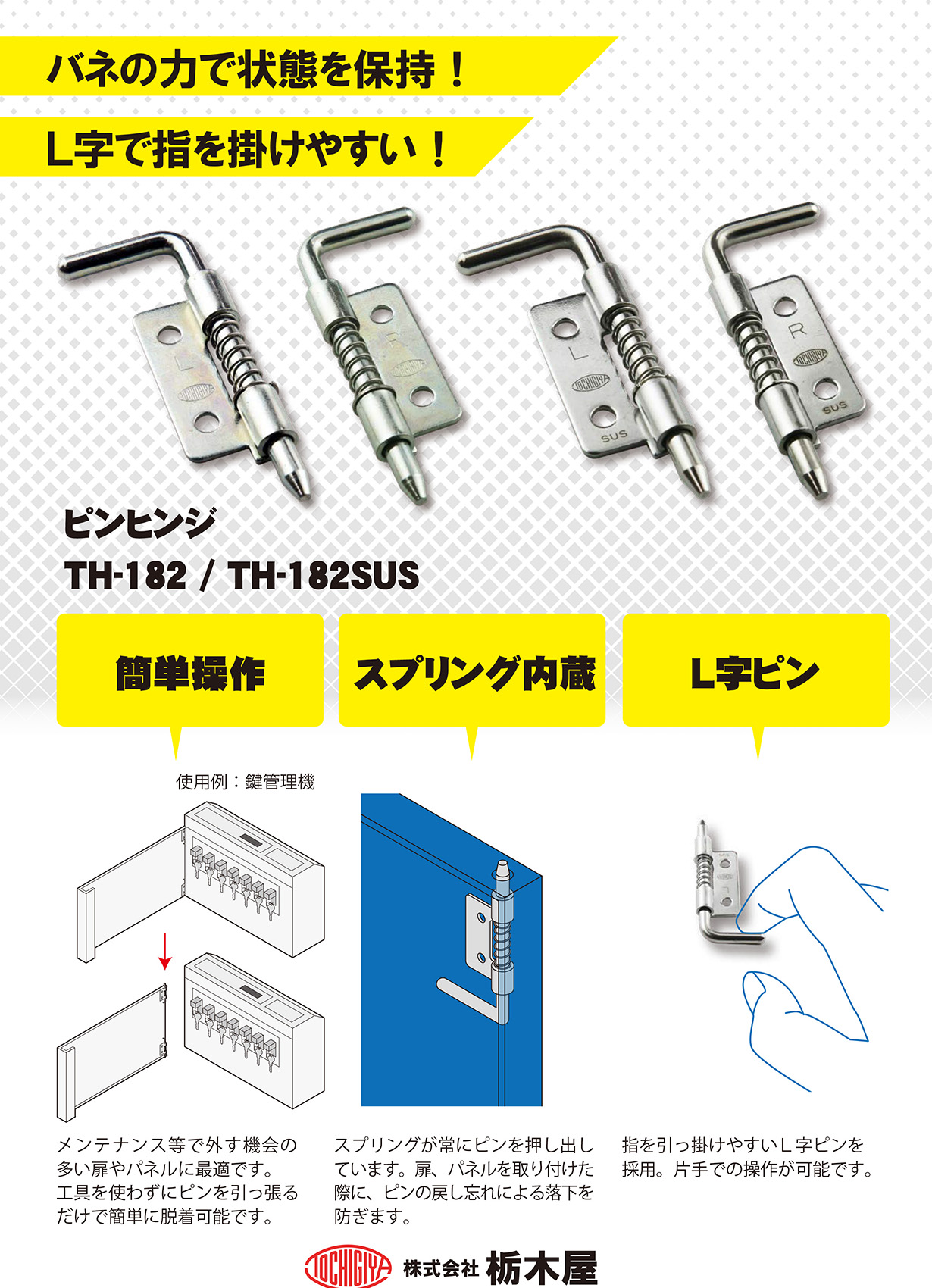 シャフトの抜差しにより扉を外すことができます。スプリング内蔵の為、シャフトの脱落を防ぎます。