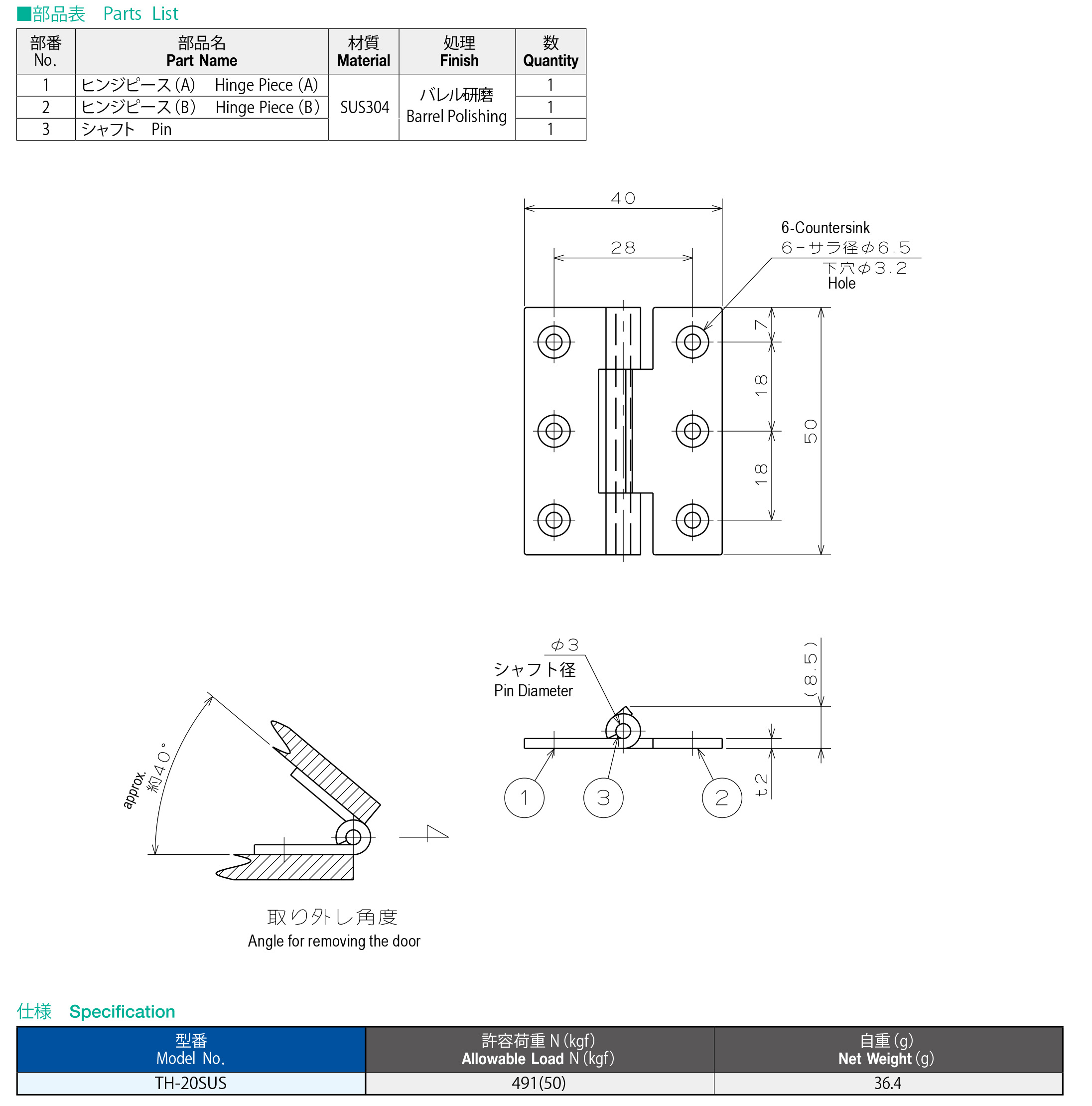 蓋等の取り付け、取り外しが容易に行える蝶番です。