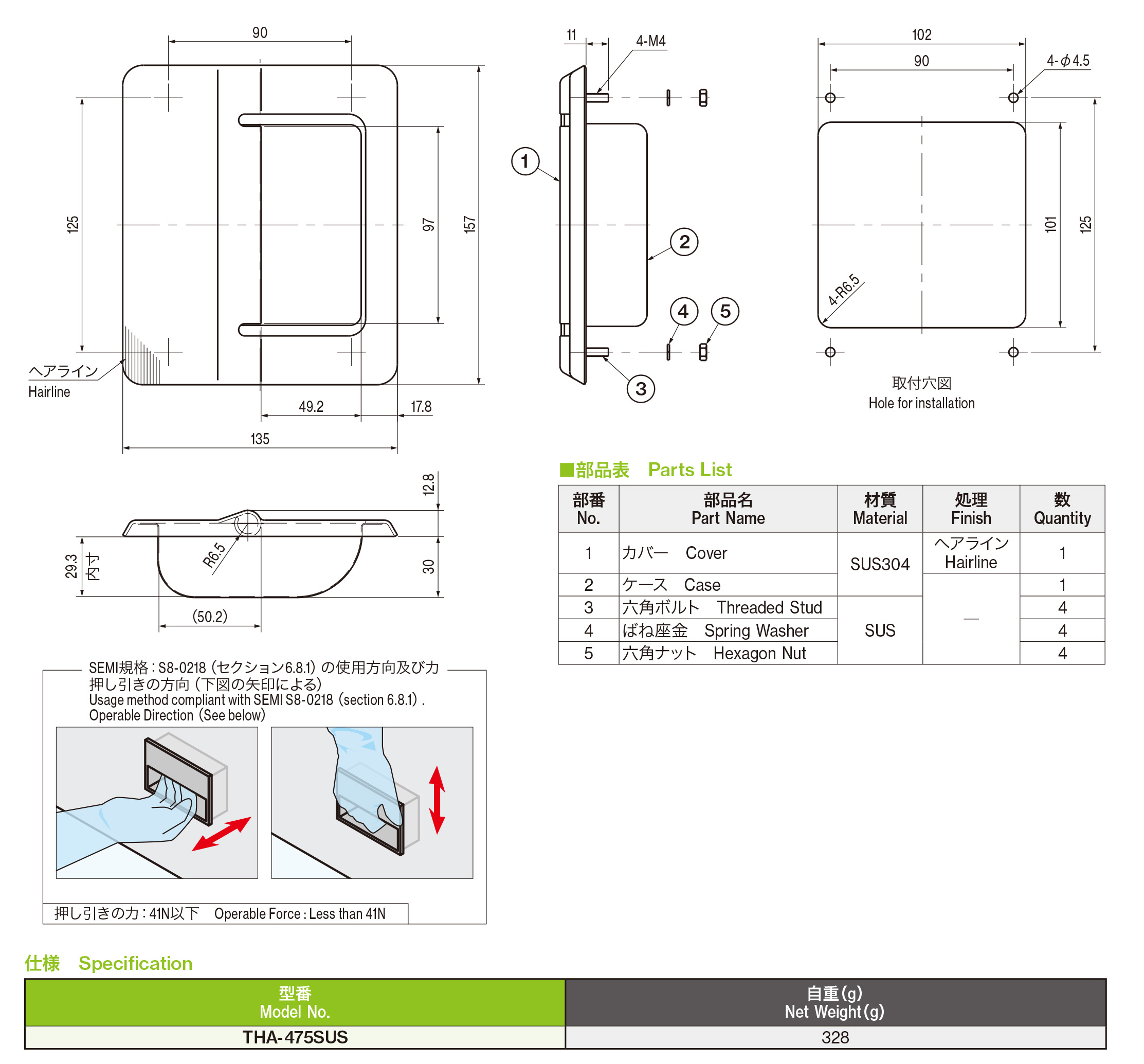 SEMI 規格S8-0218 セクション6.8.1「フック握り型ハンドル(4 本指)クリーンルーム用手袋着用時」の規定に適合しています。