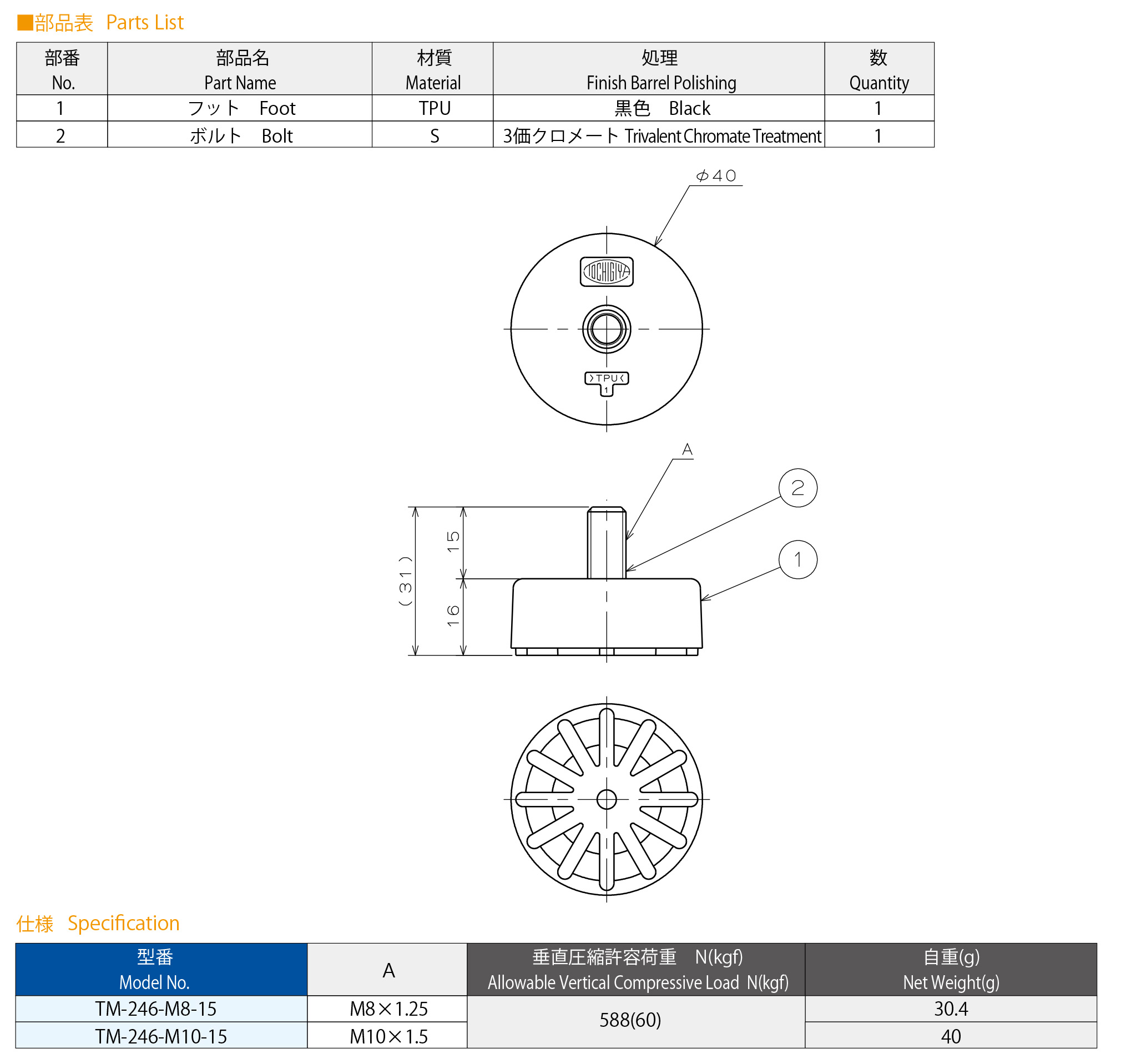 | タイプ | 材質 | 垂直圧縮許容荷重[kN(kgf)] | 高さ(mm) | ねじ長さ(mm) | ねじ径 |